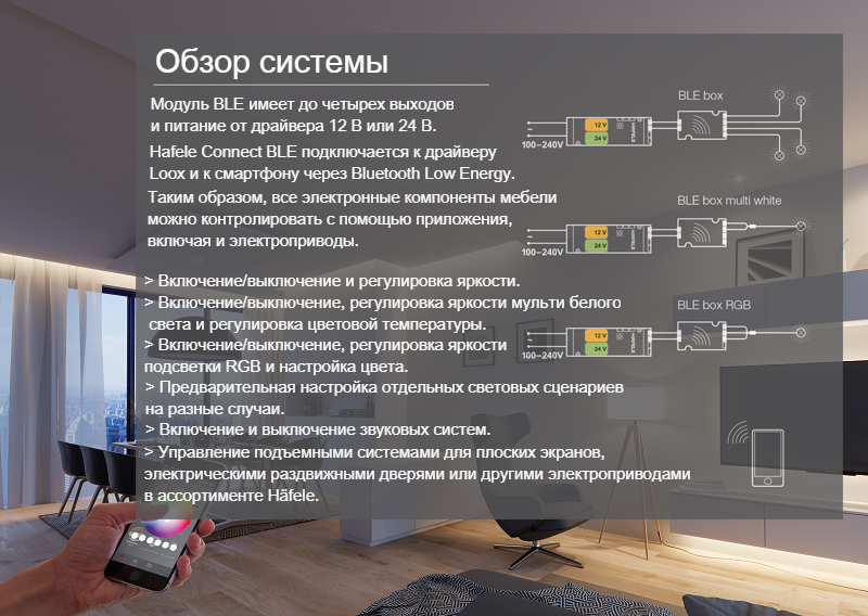 Häfele Connect предоставляет полный спектр возможностей управления, включая настройки света RGB, регулировка яркости и изменения цветовой температуры свечения. Разнообразие применения и комбинация светильников позволяет создавать много сценариев, которые можно хранить и автоматически воспроизводить или управлять простым нажатием. «Умное» программное обеспечение позволяет управлять мебелью и пространством - открывать, закрывать, освещать, смещать и тому подобное.