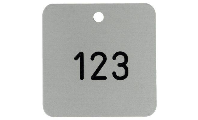 Технические характеристики Брелок, алюминий серебристый, 40 х 40 мм отверстие слева (нумерация на заказ)