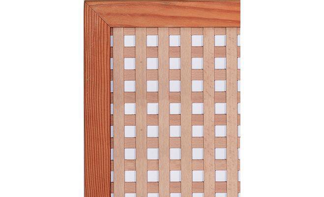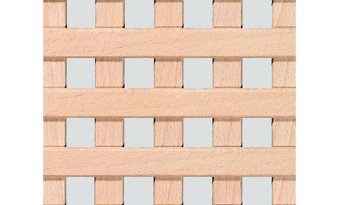 Декоративная решетка для филенок дверей, испанских стенок, для облицовки радиаторов отопления или вентиляционных отверстий. Решетка изготовлена из планок (ель натуральная), отфрезерованных и тонко отшлифованных, закругленных с обеих сторон и направленных под углом 90 °. Размер решетки 1200х600х4 мм, ширина планки 12мм, расстояние между планками 12 мм.