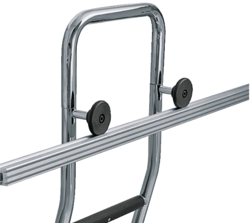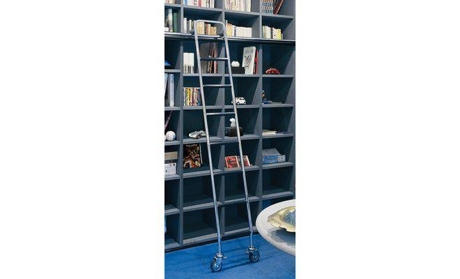 Раздвижная лестница для библиотек , гостиниц и частных владений. Данная версия лестницы оснащена роликами на шарикоподшипниках с резиновым покрытием , с нескользящим балками. Лестница изготовлена из хромированной стали серого цвета с лакированной поверхностью, балки изготовлены из хромированной стали с пластиковым покрытием черного цвета , ролики и крышка изготовлены из пластмассы.