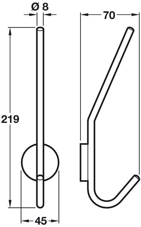 Гардеробный крючок для шляпы и пальто, с креплением в виде круга. Крючок изготовлен из нержавеющей стали, класса качества 1.4301, с матовой поверхностью. Способ крепления: скрытый, путем прикручивания шурупами к вертикальной поверхности. Размеры крючка, глубина / высота / диаметр - 70/219/8 мм, расстояние между отверстиями: 17 мм, диаметр крепления: 45 мм.