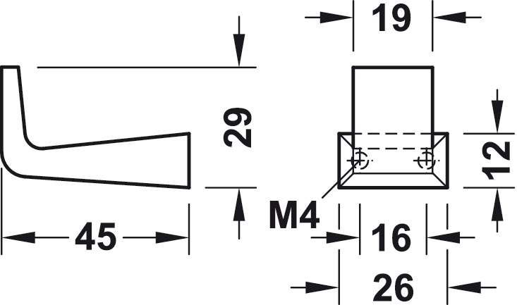 Размеры крючка, ширина / глубина / высота – 26 / 45 / 29 мм, расстояние между отверстиями 16 мм.