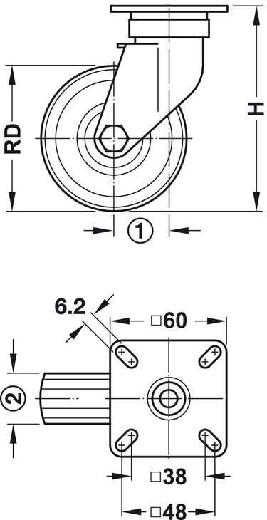 Монтаж: Крепежная пластина Ø колеса RD: 50 мм
