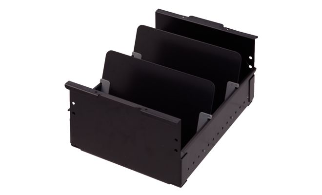 Ящик для картотеки черного цвета, изготовлен из стали. Используется для хранения хранения листов формата А5.