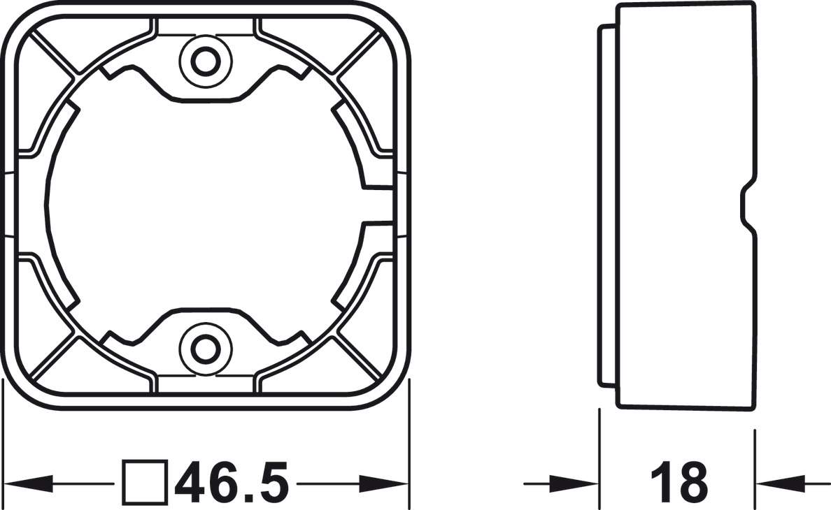 - Накладной монтаж: Используется рамка (корпус) размером 46,5 x 46,5 x 18 мм.