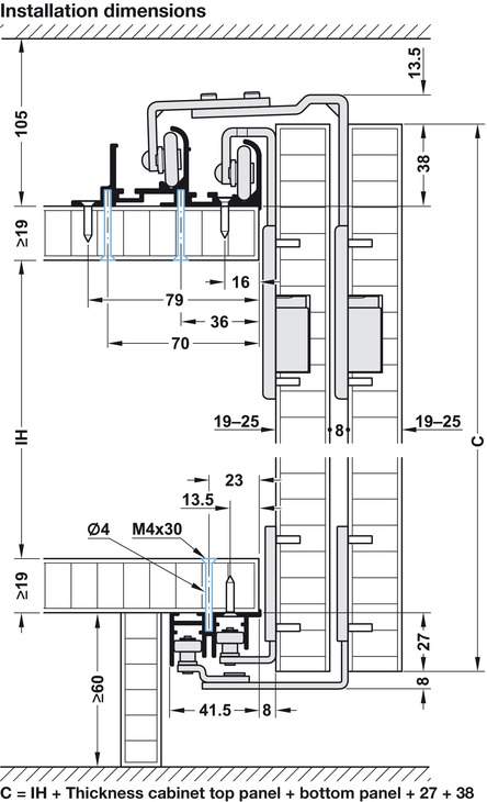 Для 1 двери: мин. 620 мм с механизмом мягкого закрытия с обеих сторон для 2 дверей: мин. 400 мм с механизмом мягкого закрывания с одной стороны, мин. 620 мм с механизмом мягкого закрытия с обеих сторон на 3 двери: мин. 400 мм с механизмом мягкого закрывания с одной стороны, мин. 990 мм с механизмом мягкого закрытия с обеих сторон