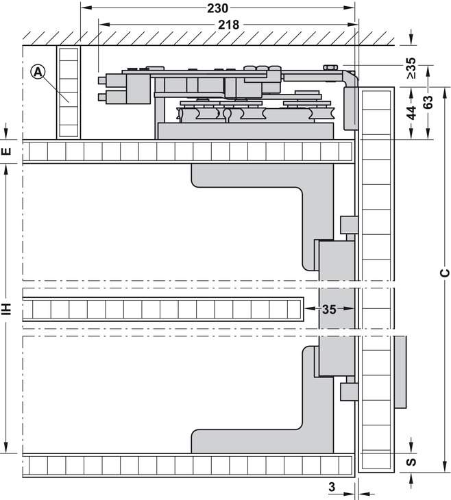 - Монтаж: Ходовой механизм и шины для привинчивания, вариант "высокий комод/буфет-сервант": Смонтировать ходовой механизм с нижним ходом, вариант "верхний шкаф": Смонтировать ходовой механизм с верхним ходом
