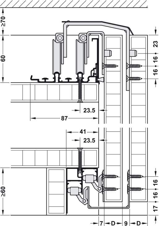 Описание Комплект фурнитуры Finetta F-Line31 70A для 2-х дверных полотен до 30 мм с демпфером