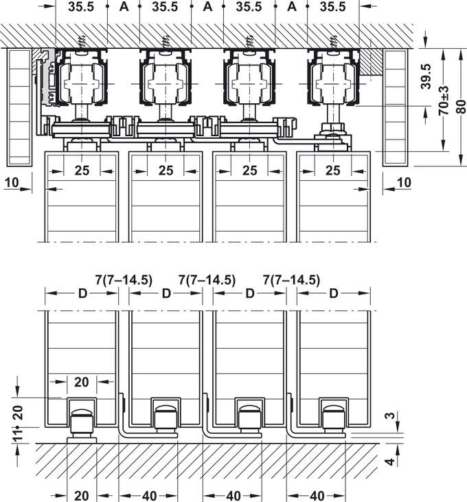 Комплект фурнитуры для раздвижных дверей 100-A (до 100 кг) предназначен для установки деревянных раздвижных дверей с 2–4 полотнами. Система обеспечивает верхнее скольжение и потолочный монтаж, что идеально подходит для гибкого разделения пространства или создания визуальных перегородок в помещении. Благодаря возможности регулировки высоты и надежным механизмам, система гарантирует плавность хода даже при большом весе дверей.