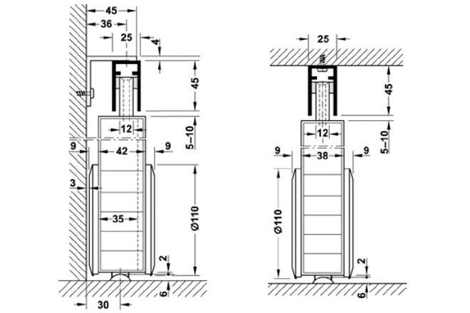 Технические характеристики Комплект фурнитуры DESIGN 150-U нержавеющая сталь для одного деревянного дверного полотна 150 кг с верхней и нижней ходовой шиной алюминий без покрытия 2 м