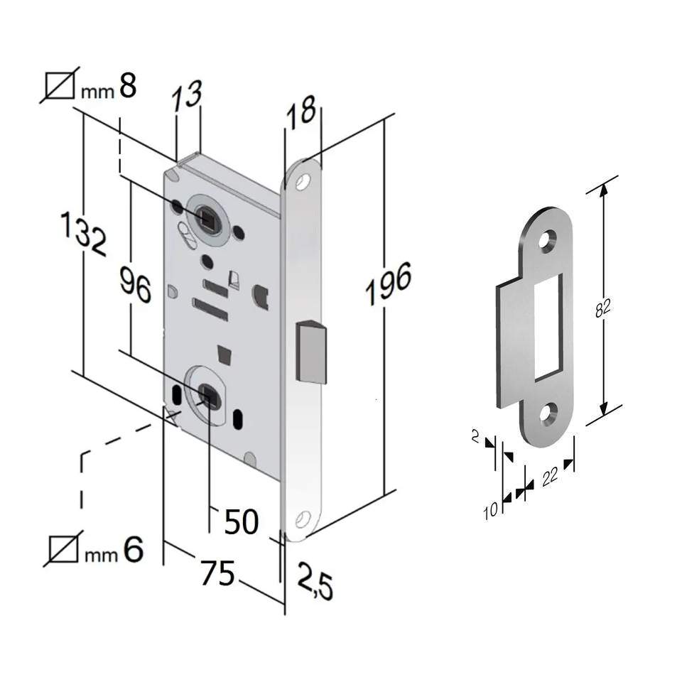 Описание Комплект механического замка WC 18x196 мм сталь хром матовый 8/6 мм с ответной планкой и шурупами 48911012
