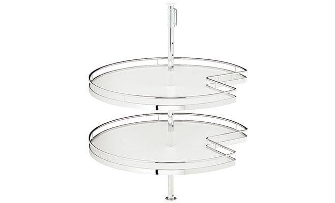 Комплект поворотной фурнитуры на три четверти круга, для накладных дверей, с позиционирующим устройством, с двумя полками Arena Classic, с противоскользящим покрытием, материал: трубчатая ось и обрамелние: сталь, хромированная/полки: древесина, покрытая пластмассой белого цвета, возможно укорачивание трубчатой оси сверху до высоты корпуса 480 мм, высота регулируется в пределах 839-889 мм, для тумбы 800х800 мм, диаметр полок 700 мм, для монтажа путем привинчивания между верхним и нижним щитами, в комплект входит: 1 трубчатая ось диаметром 25 мм с рядом отверстий, 2 полки на три четверти круга.