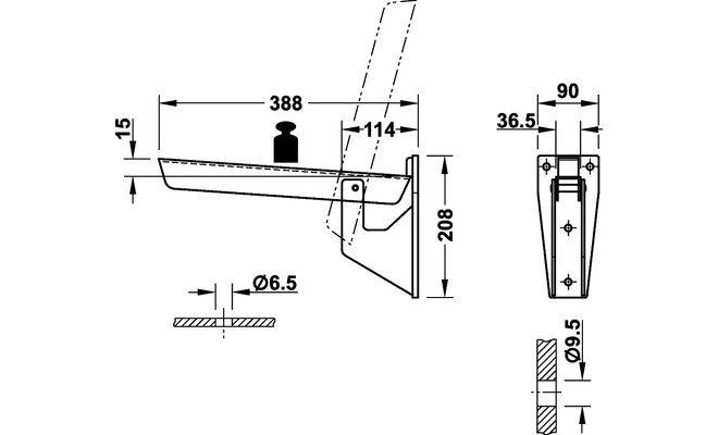 Консоль, откидная, Hebgo, с пружиной для складывания, пригодна для рабочих плит и скамеек, материал: сталь, оцинкованная, полезная длина консоли для сидения 380 мм, несущая способность на пару 500 кг.