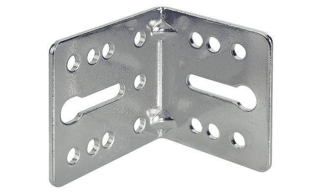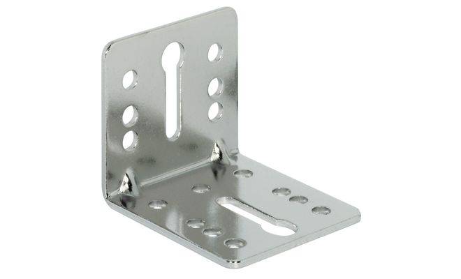 Монтажный уголок с 2 продольными пазами, изготовлен из никелированной стали. Размеры уголка (мм): ширина = 55х45мм, длина 50 мм.