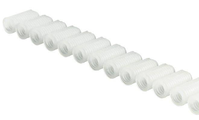 Распорная муфта для запрессовки, изготовлена из пластмассы (полиамид) натурального цвета. Муфта для отверстия диаметром 5 мм, длина распорной муфты 12 мм. Исполнение: 20 штук отлитых вместе в виде ленты.