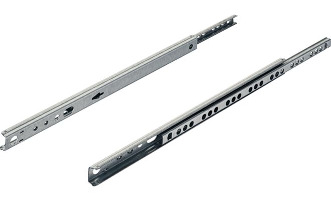 Шариковая направляющая выдвижных ящиков с механизмом частичного выдвижения. Изготовлена из оцинкованной стали толщиной 1 мм с возможностью нагрузки до 10 кг монтаж под паз.
