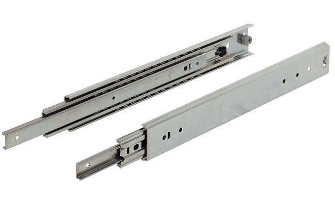 Шариковая направляющая для ящиков оснащена механизмом полного выдвижения, изготовленная из стали с оцинкованной поверхностью.