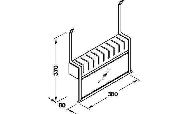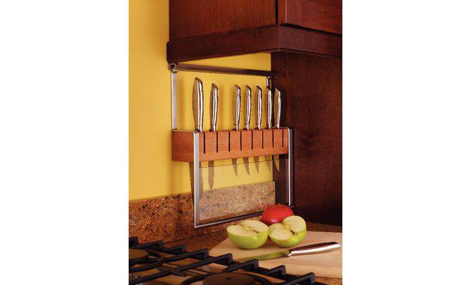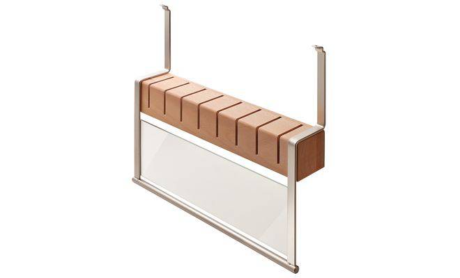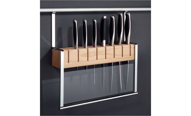 Навесной держатель с деревянным блоком для ножей. Несущий элемент держателя изготовлен из стали с поверхностью под нержавеющую сталь, защитная крышка изготовлена из акрилового стекла, деревянный блок изготовлен из массива бука. Размеры держателя: ширина 380 мм, глубина 80 мм, высота 370 мм.
