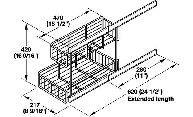 Нижний выдвижной механизм для шкафа под мойкой, с надежно приваренной корзиной, для правого и левого ручного использования. Выдвижной механизм изготовлен из хромированной стали и предназначен для внутренней ширины установки 140 мм, длина выдвижения 335 мм. Размер выдвижного механизма: ширина 470 мм, глубина 117 мм, высота 400 мм. Монтаж выполняется путем крепления винтами к боковой панели шкафа.