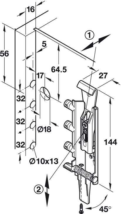 Несущая способность подвеса -130 кг на пару, монтаж выполняется путем запрессовки, для быстрого монтажа с рычагом. Подвес для шкафов для левостороннего крепления.