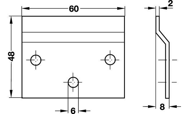 Навесная планка к подвесу для шкафов, изготовлена из оцинкованной стали. Монтаж планки выполняется путем привинчивания. Размеры навесной планки: длина / высота / толщина / диаметр отверстий - 60/48/2/6 мм.