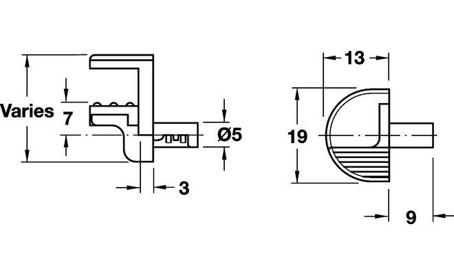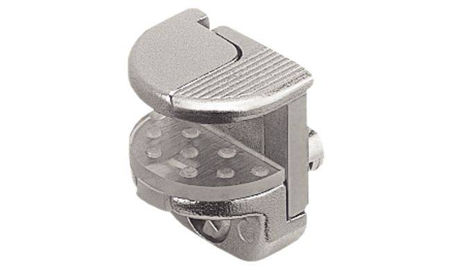 Полкодержатель для стекла, с фиксацией, материал: цинковое литье с пластиковым фиксатором, никелированный, для полок толщиной 8/10/12 мм, для вставляния в сверловое отверстие диаметром 5 мм, из двух частей, фиксирующий елемент удерживает полку в одном положении и препятствует опрокидыванию.