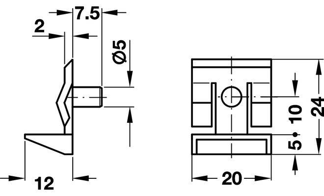 Полкодержатель для стекла, с зажимным стопором, материал: пластмасса, цвет: белый, для вставляния в сверловое отверстие диаметром 5 мм, несущая способность 80 кг.