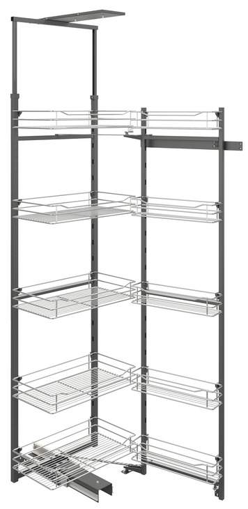 Описание Полный комплект выдвижного шкафа пенала для кухни с 5 проволочными корзинами и навесными полками, хром, для корпуса 600 мм, высота 1900 - 2200 мм