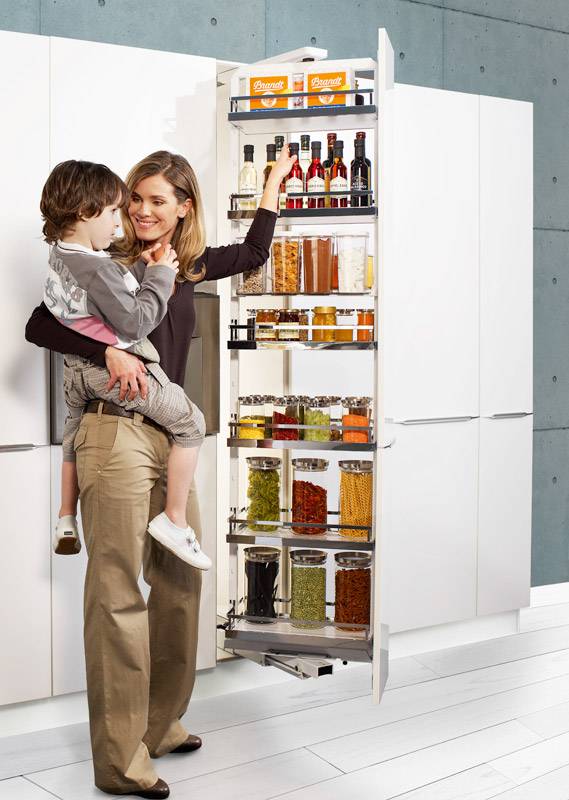 Описание Полный комплект шкафа Dispensa 400 мм 1600 - 2000 мм с функцией ClickFixx и SoftStopp с 5-ю корзинами Arena Classic 350 х 462 х 106 мм
