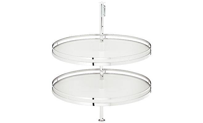 Круглая поворотная фурнитура, с 2 круглыми полками Arena Style, с противоскользящим покрытием, для накладных дверей 45°, с регулировкой по высоте, материал: фурнитура: сталь, хромированная/дно: древесина, покрытая пластмассой, белого цвета, для шкафа 900х900 мм, диаметр 700 мм, высота 839-889 мм, несущая способность 20 кг/полка.