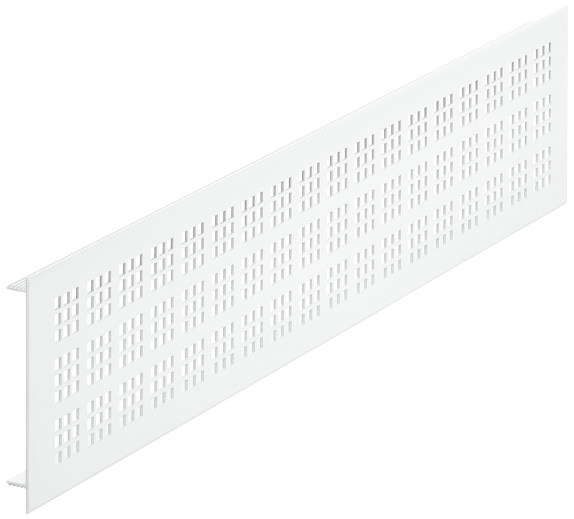 Прямоугольная вентиляционная решетка с перфорацией и рифлеными перемычками. Вентиляционная решетка изготовлена из алюминия с пластиковой поверхностью белого цвета. Ширина решетки 100 мм, длина 1000 мм, толщина 1,5 мм, размер выреза 985х85 мм, площадь прохода 256,5 см ². Монтаж решетки выполняется путем запрессовки.