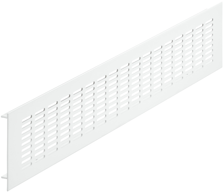 Вентиляционная решетка, прямоугольная, с прорезями и скошенными видимыми кромками, материал: алюминий, покрытый пластмассой, цвет: белый, высота решетки 100 мм, длина 480 мм, толщина 1,5 мм, размер выреза 458х85 мм, площадь прохода 133,6 см ², размер отверстий 20 х3 мм, для монтажа путем запрессовки.
