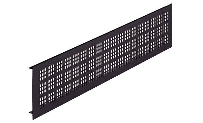 Прямоугольная вентиляционная решетка с перфорацией и рифлеными перемычками. Вентиляционная решетка изготовлена из алюминия с анодированной поверхностью серебристого цвета. Ширина решетки 100 мм, длина 1000 мм, толщина 1,5 мм, размер выреза 985х85 мм, площадь прохода 256,5 см ². Монтаж решетки выполняется путем запрессовки.