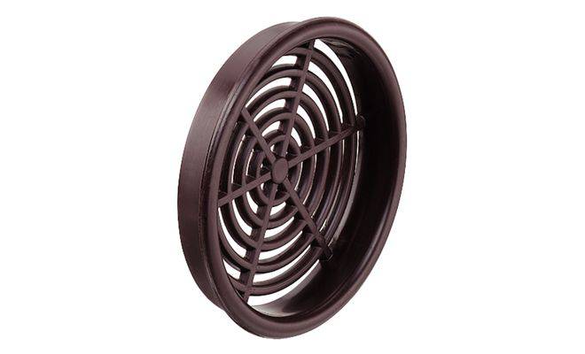 Вентиляционная решетка, круглая, с защитной кромкой, материал: пластмасса, цвет: коричневый, диаметр с кромкой 65 мм, диаметр без кромки 60 мм, толщина кромки 2 мм, глубина решетки 9 мм, для монтажа путем врезания.