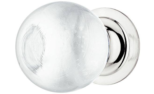Мебельная ручка-кнопка для деревянных дверей изготовлена из прозрачного стекла шарообразной формы. Основа ручки изготовлена из хромированной латуни с полированной поверхностью.