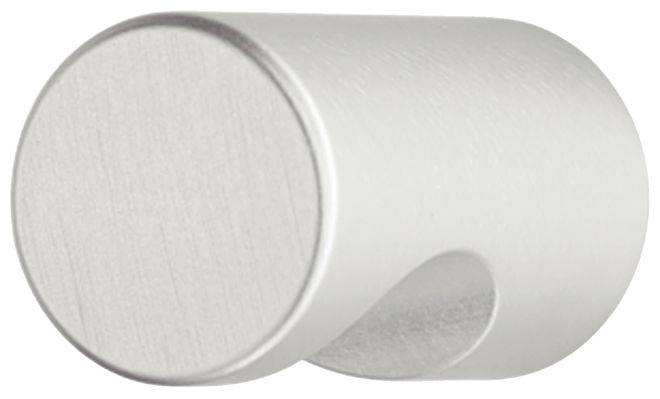 Мебельная ручка-кнопка цилиндрической формы с боковым углублением под пальцы, для деревянных дверей. Изготовлена алюминия с анодированной поверхностью серебристого цвета.