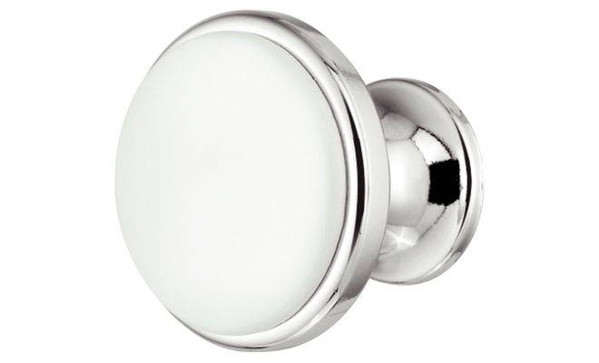 Мебельная ручка-кнопка круглой формы с вставкой белого цвета для деревянных дверей. Изготовлена из цинкового сплава цамак с хромированной полированной поверхностью.