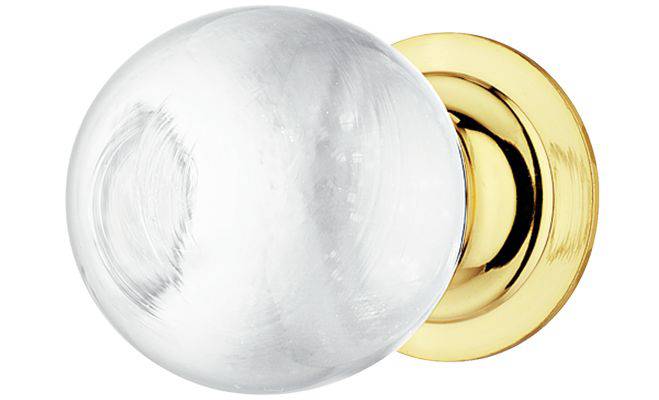 Мебельная ручка-кнопка для деревянных дверей изготовлена из прозрачного стекла шарообразной формы. Основа ручки изготовлена из латуни с полированной поверхностью.