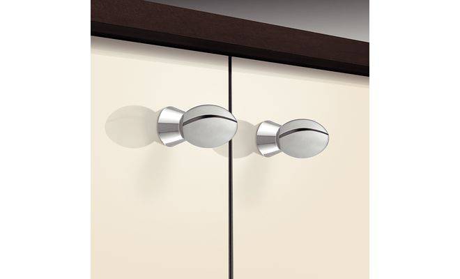 Мебельная ручка, изготовленная из пластика цвета хрома.