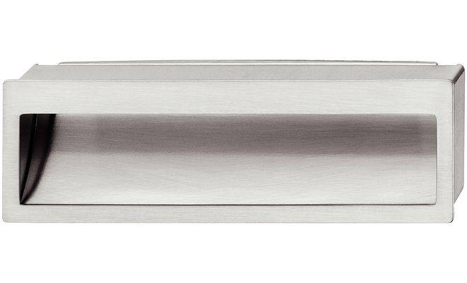 Мебельная врезная ручка для деревянных дверей. Изготовлена из цинкового сплава цамак с поверхностью цвета нержавеющей стали.