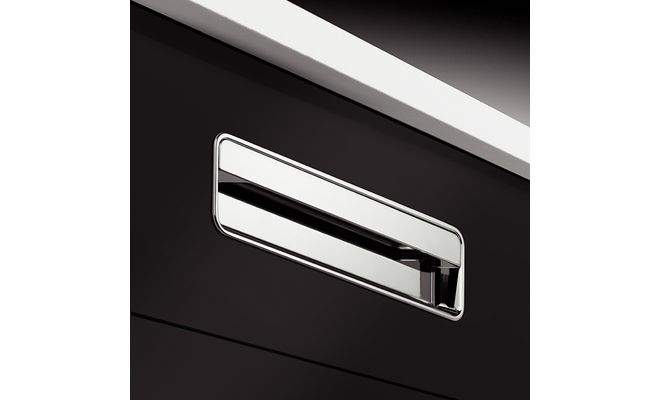 Цамак достаточно прочный, поэтому ручки имеют цельную сложную форму. Их поверхность сохраняет свой цвет на протяжении всего времени пользования. Врезная белая ручка с матовой поверхностью хорошо сочетается с черным, белым фасадом.