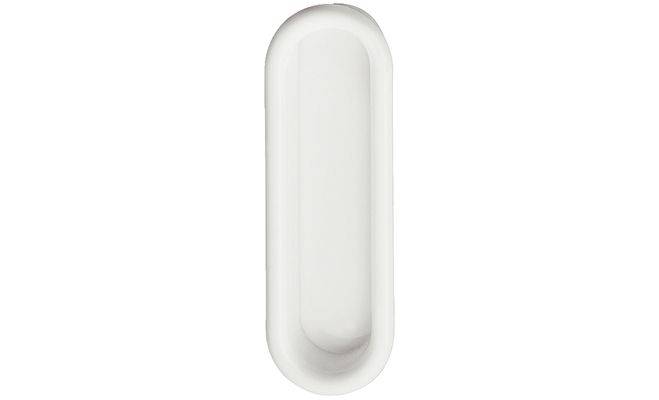 Мебельная врезная ручка для деревянных дверей. Изготовлена из пластмассы белого цвета.