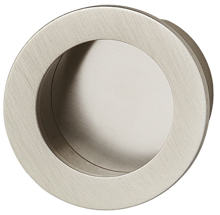 Мебельная врезная ручка круглой формы для деревянных дверей. Изготовлена из никелированной латуни с матовой поверхностью.