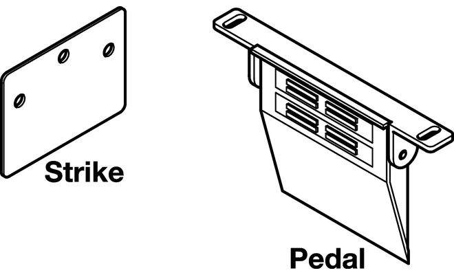 Роликовая педаль для открывания поворотных дверей шкафа без применения рук. Материал: ножная педаль: пластмасса, черного цвета/роликовый элемент: пластмасса, белого цвета/пластина: сталь, лакированная, черного цвета, для высоты плинтуса мин. 100 мм.
