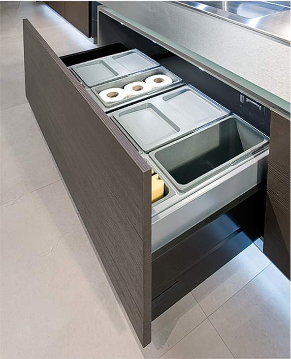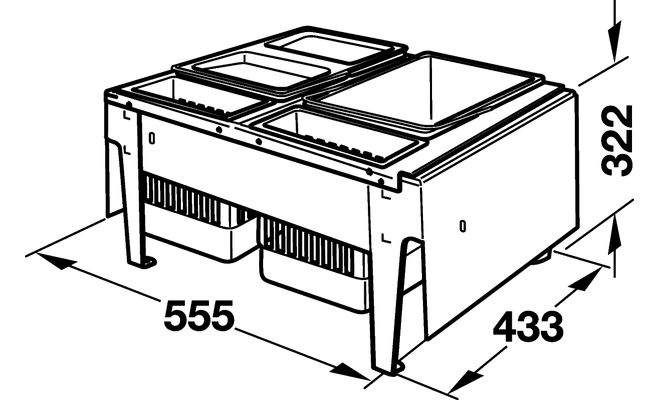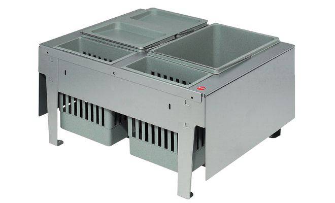 Мусорные контейнеры для вставки в направляющую систему для выдвижных ящиков, для монтажа за лицевой панелью. Мусоросборник предназначен для ширины корпуса от 600 мм, и оснащен 5 контейнерами емкостью: 1 х 18 л, 2 х 8,5 л и 2 х 4,1 л - контейнеры для посуды. Контейнеры с крышками изготовлены из пластмассы серого цвета, держатель изготовлен из стали серебристого цвета. Номинальная длина 500 мм.