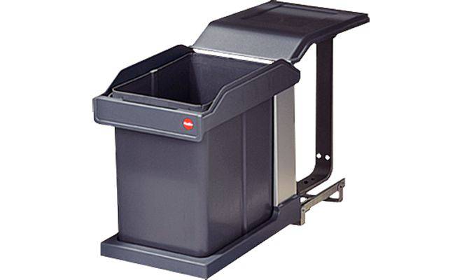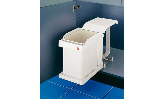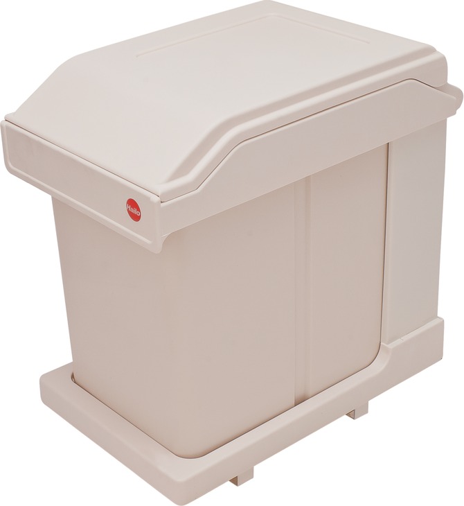 Мусорный контейнер емкостью 20 л с механизмом частичного (ручного) выдвижения с поводком. Мусоросборник предназначен для ширины корпуса от 300 мм, для монтажа за поворотными дверями. Выдвижной элемент изготовлен из стали с пластмассовым покрытием кремово-белого цвета, контейнер и крышка изготовлены из пластмассы кремово-белого цвета. Монтаж выполняется путем привинчивания к нижней панели.