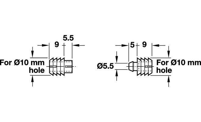 Стяжка для ручки-кнопки, для разъемных соединений, для глубины сверления 15/10 мм. Стяжка изготовлена из полиамида натурального цвета, состоит из 2 секций. Монтаж выполняется путем запрессовки в отверстие Ø 10 мм.