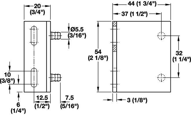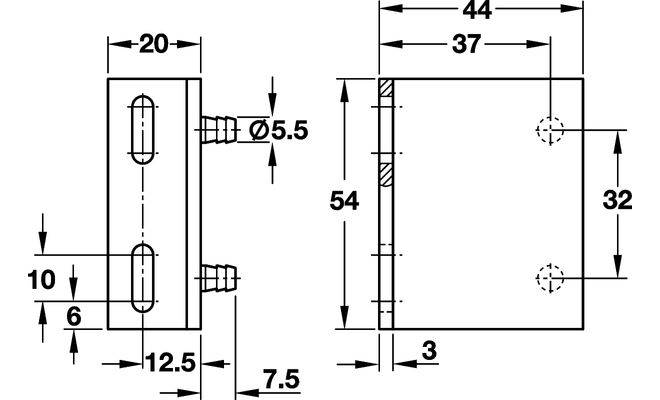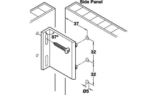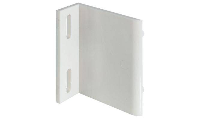 Монтажный уголок для задней стенки, изготовлен из пластмассы белого цвета. Размеры уголка (мм): ширина сторон 44х20мм, длина 54 мм. Монтаж уголка выполняется путем запрессовки в отверстие 5 мм (для ряда отверстий 32 мм) и привинчивания к задней стенке. Уголок подлежит настройке через продольный паз.
