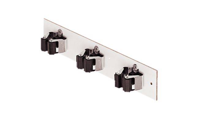 Планка с 4 фиксированными держателями для инвентаря с ручками толщиной 23-28 мм. Держатели изготовлены из оцинкованной полированной стали, планка изготовлена из МДФ с пластиковым покрытием белого цвета, ролики: резина. Размеры: ширина 440 мм, длина 58 мм, высота 60 мм. Монтаж держателя выполняется путем привинчивания.