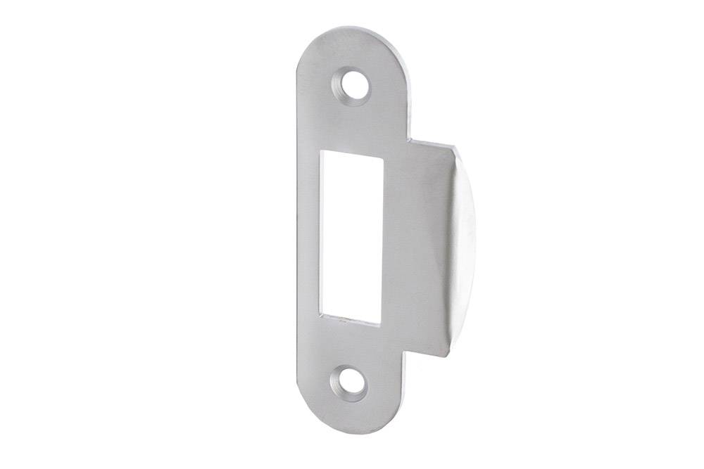 Планка замка, с выступом. Универсальная, правая или левая по DIN.Материал: сталь. Покрытие / цвет: хромированная матовая. Размеры планки замка: Высота: 82 мм. Ширина: 22 мм. Толщина: 2 мм. Выступ: 12 мм. Размер отверстия под ригель замка: 12.5 х 34 мм.